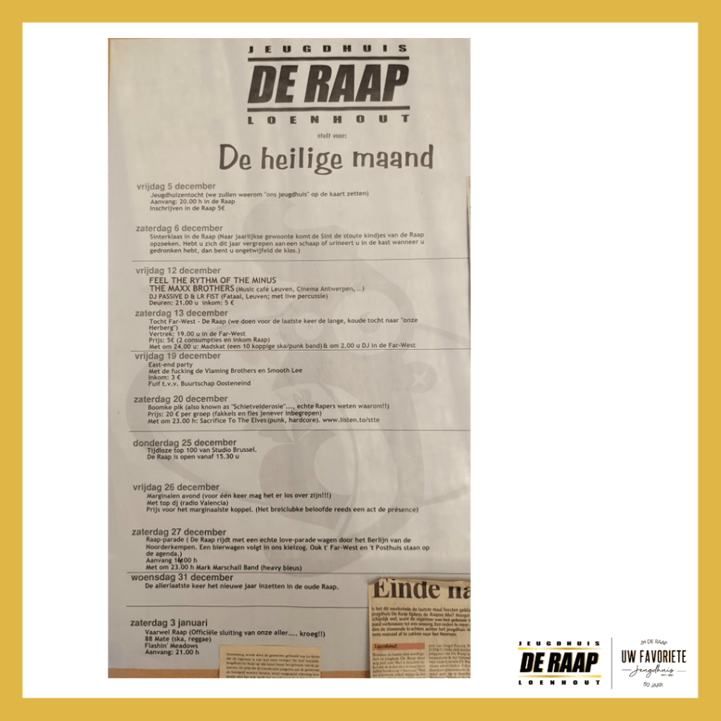 In die tijd was het zo dat je lid moest zijn van het jeugdhuis, anders mocht je niet binnen. Zelfs op de discussieavonden op woensdagavond zat de keet dikwijls stampvol, rond de grote houtkachel. De jaren vlogen voorbij, met ups en downs. Spraakmakende optredens waren er van Dimitri Van Toren, Walter De Buck, The Kids, The Scabs, en nog veel meer. Neervenkermis vindt ook zijn oorsprong bij jeugdhuis De Raap. Zelfs toen het jeugdhuis enkele jaren dicht was, bleef dit kleine festival verder autonoom bestaan, tot op de dag van vandaag nog steeds op de Neervenweg. Vanaf 1993 waaide er een nieuwe wind in het jeugdhuis en werden er ingrijpende verbouwingen gedaan. Onder andere de toog veranderde van plaats en er werden radiators gehangen. De beroemde schildering van ‘den indiaan’, die later trouwens telkens mee verhuisde, werd op de muur van het sjotterbakkotje geschilderd.
